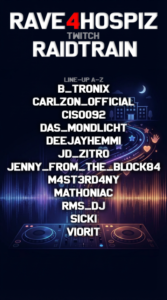 Musik verbindet, Musik bewegt und in diesem Fall: Musik hilft. Mein guter Kollege und „Abklatschbruder“ Sicki Jackson stellt mal wieder etwas Großes auf die Beine. Unter dem Motto „Rave4Hospiz“ rollt ab Ende Februar ein gigantischer Raid Train über die Twitch-Gleise.
